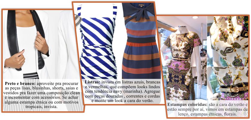 Listras: invista em listras azuis, brancas e vermelhas, que compõem looks lindos com tendência navy (marinha). Agregue com peças douradas , correntes e cordas e monte um look a cara do verão.