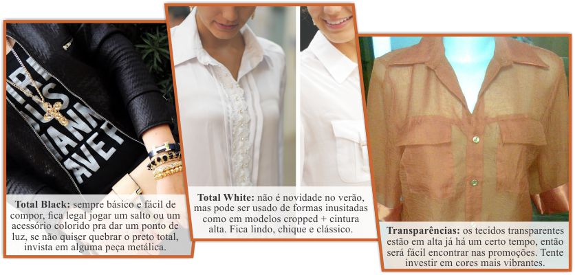 Transparências: os tecidos transparentes estão em alta já há um certo tempo, então será fácil encontrar nas promoções. Tente investir em cores mais vibrantes.