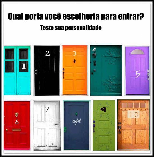O teste é super simples de fazer. Primeiro, você só precisa escolher uma das portas ilustradas na figura abaixo. No final, leia a descrição referente ao número da porta escolhida. Fácil, não é?